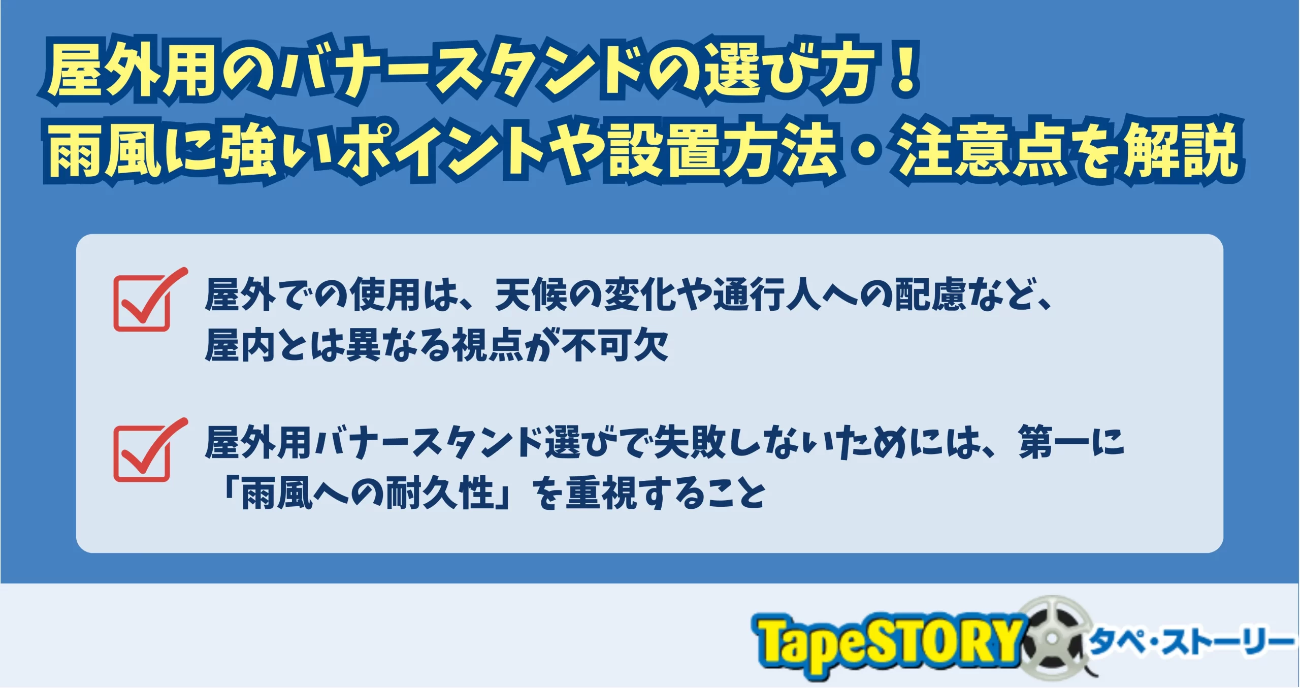 屋外用のバナースタンドは、店舗やイベントの顔となる重要な販促ツールです。しかし、屋内用とは異なり、雨や風、紫外線といった過酷な環境に耐えうる性能が求められます。