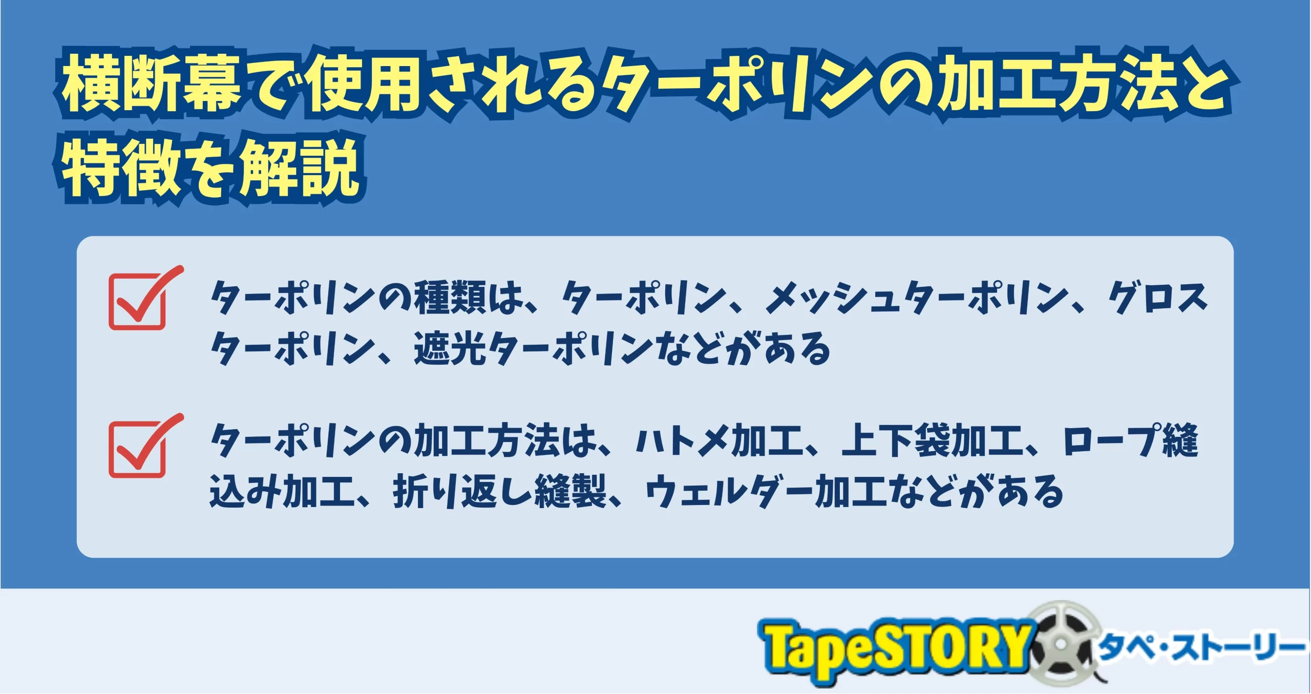 今回はターポリンの種類と加工方法を紹介してきました。例えば、メッシュターポリンと折り返し縫製でハトメ加工をすると、高いところでも破れにくい通気性のある横断幕を作ることができます。このようにターポリンの種類や加工方法を組み合わせることで、長持ちする丈夫な幕を作ってみましょう。