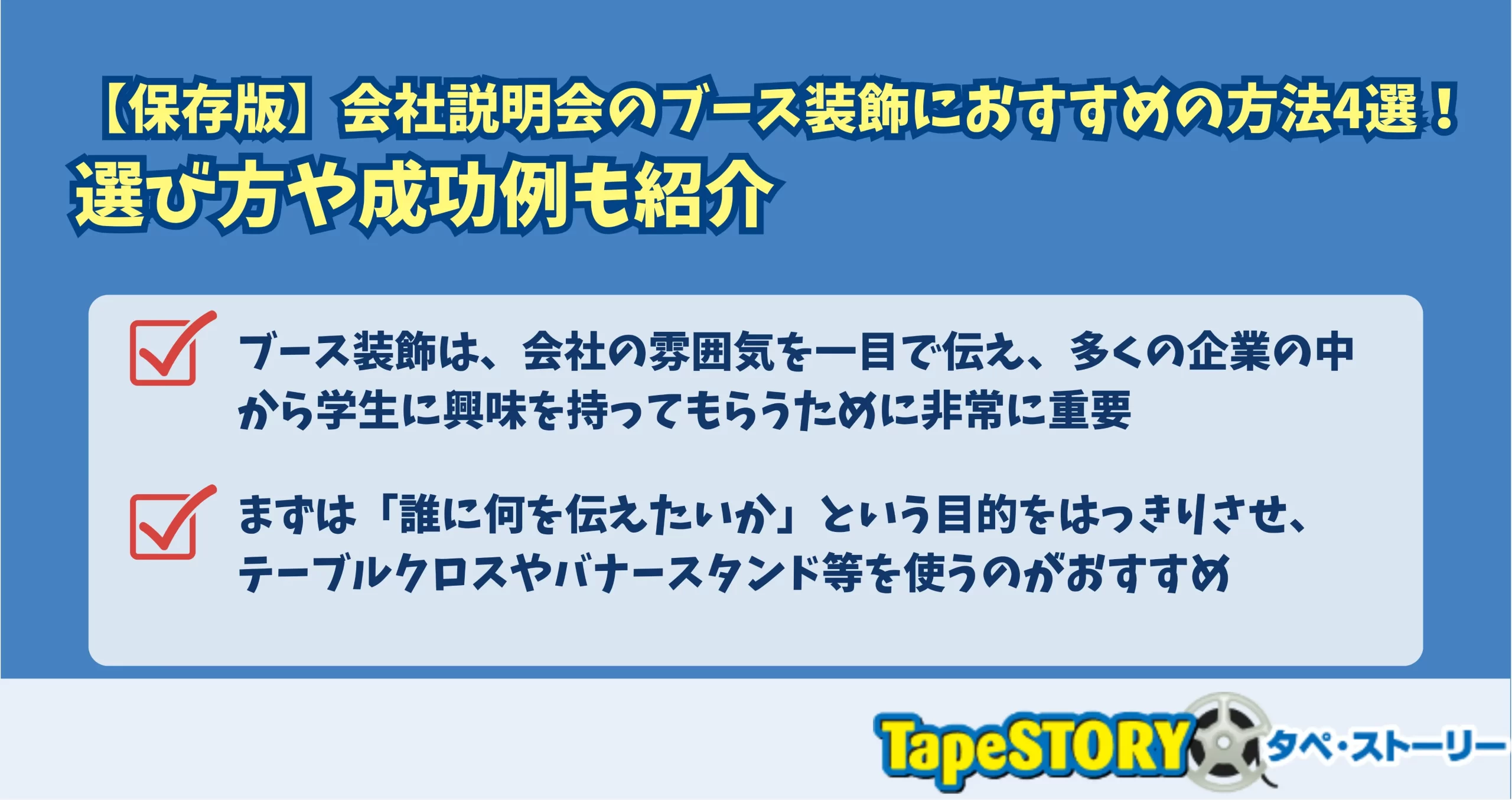 今回は、会社説明会のブース装飾について解説しました。ブース装飾は、会社の雰囲気を一目で伝え、多くの企業の中から学生に興味を持ってもらうために非常に重要です。