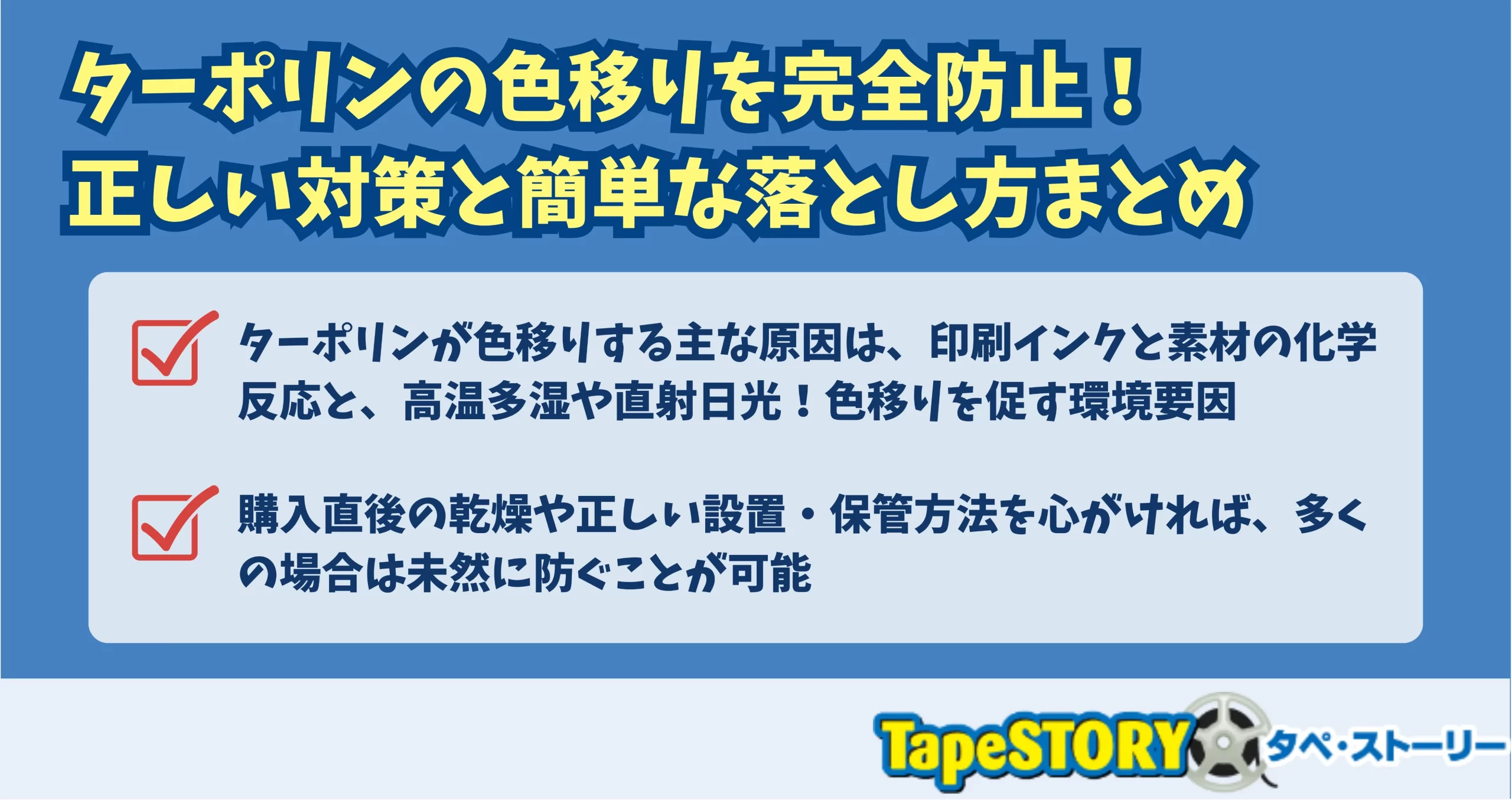 ターポリンの色移りは、「インクの化学反応(ブリード現象)」と「高温多湿・直射日光」などの環境が重なることで起こりやすくなります。しかし、購入直後の乾燥や正しい設置・保管方法を心がければ、多くの場合は未然に防ぐことが可能です。