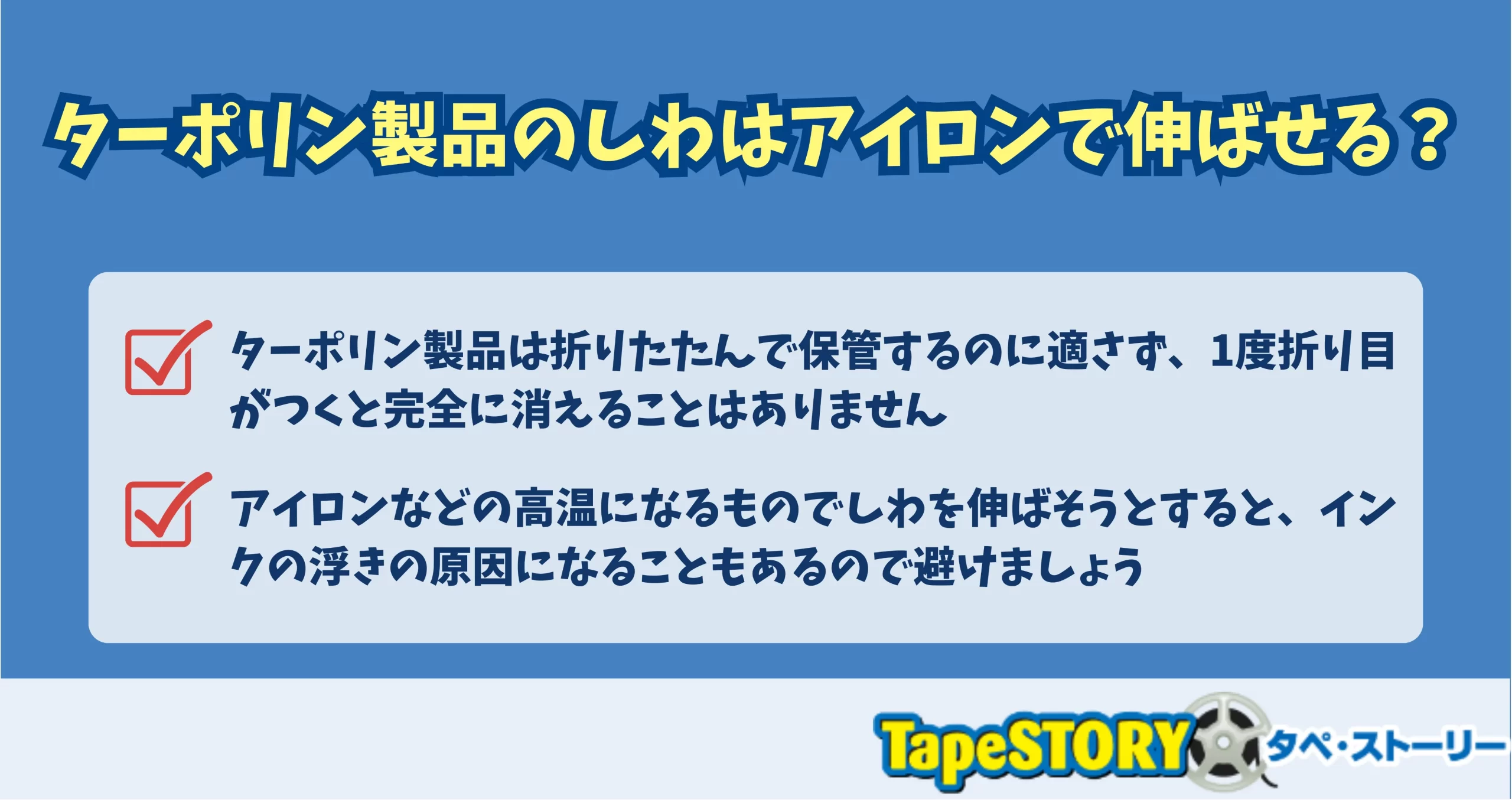 アイロンなどの高温になるものでしわを伸ばそうとすると、インクの浮きの原因になることもあるので避けましょう。ターポリン製品を、たたんだままにしておくだけでもインクが剥がれてしまうこともあります。