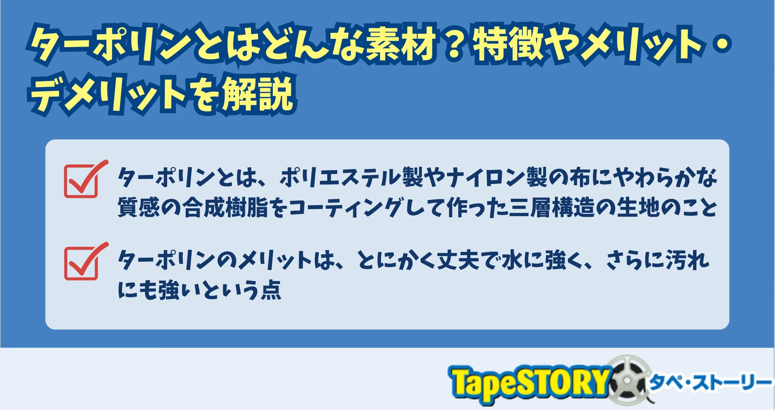 横断幕や展示会用の幕を準備したいけど、屋外で使うから丈夫で雨風に強い素材を選びたい。そんなときにターポリンは役立ちます。ターポリンは耐久性や耐水性、防汚性が高いので、特に屋外での使用におすすめです。この記事ではターポリンの特徴を詳しく解説するとともに、ターポリンの種類やメリット・デメリットについて紹介します。