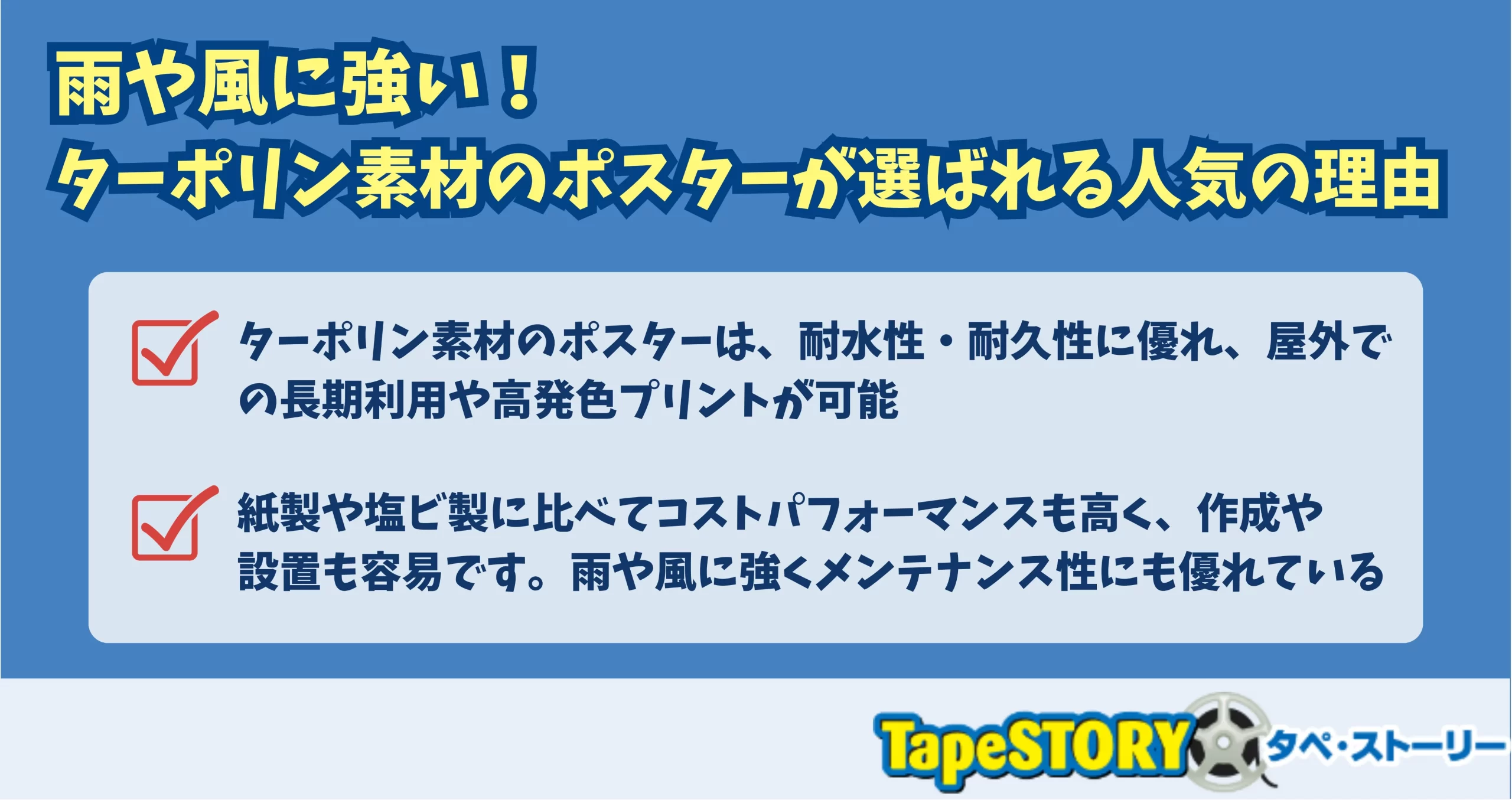 ターポリンポスターは、雨風に強く、長期間きれいな状態を保てるため、屋外での掲示にぴったりの素材です。印刷の美しさも魅力で、店舗広告やイベント案内、選挙ポスターなど幅広い用途に活用されています。雨や風に強くメンテナンス性にも優れているため、看板や案内表示、選挙ポスターまで幅広く活用できます。