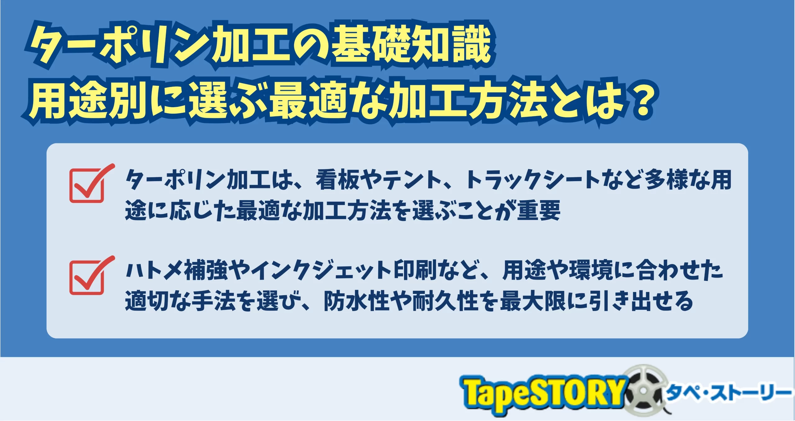 ターポリン加工とは何かから始まり、用途に応じた最適な加工方法、防水・耐久性の違い、主な加工技術までを網羅的に解説します。本記事を読むことで、屋外広告、テント、トラックシートなど多様な用途に応じた適切なターポリン加工の選び方を理解でき、失敗しない加工方法の判断が可能になります。