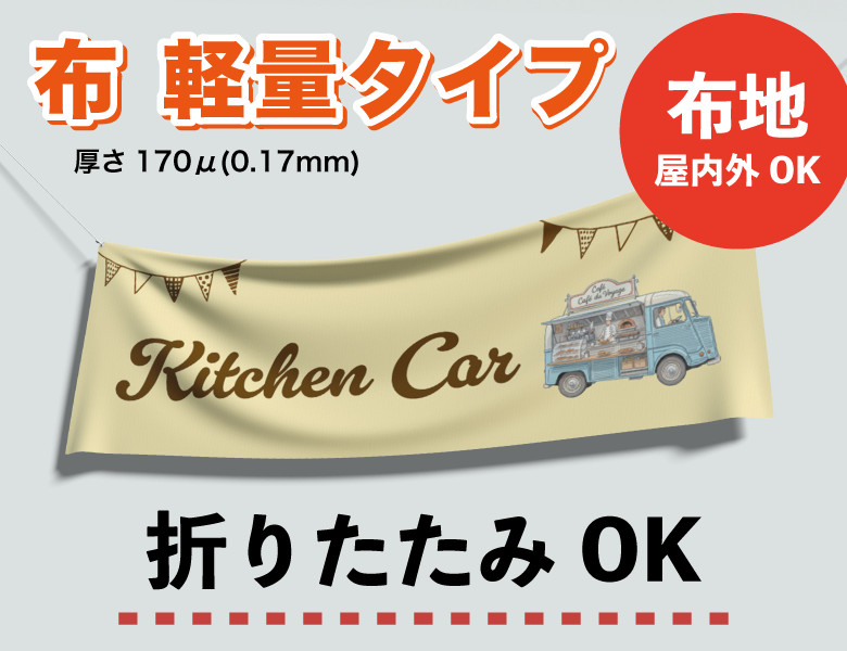 布 軽量タイプは薄手の布生地です。通常の横断幕のように掲示する他に、手持ちの横断幕やフラッグとしてもご利用いただけます。