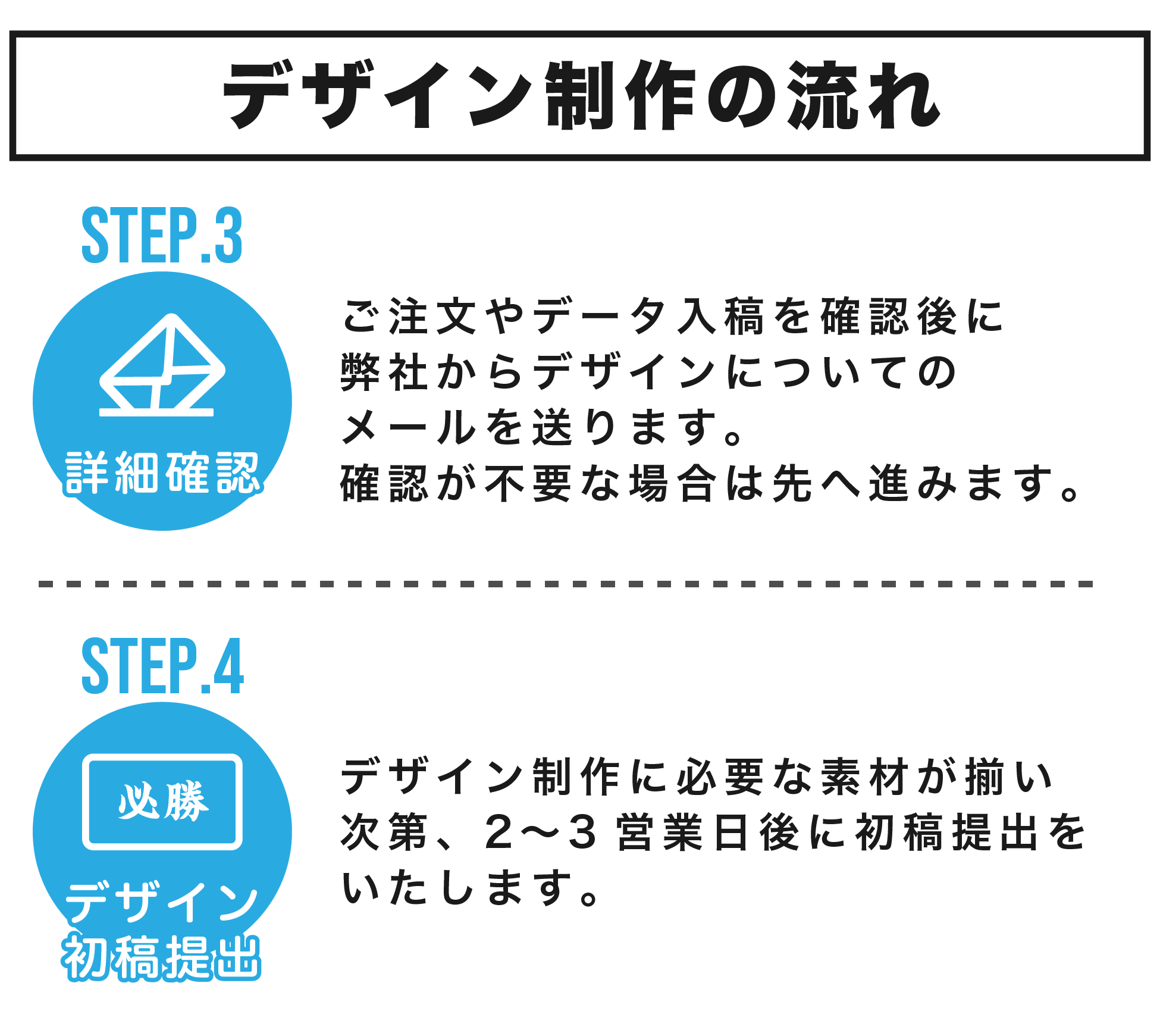 通常の完成データのご入稿とことなり、デザイン制作は製作期間が必要となります。