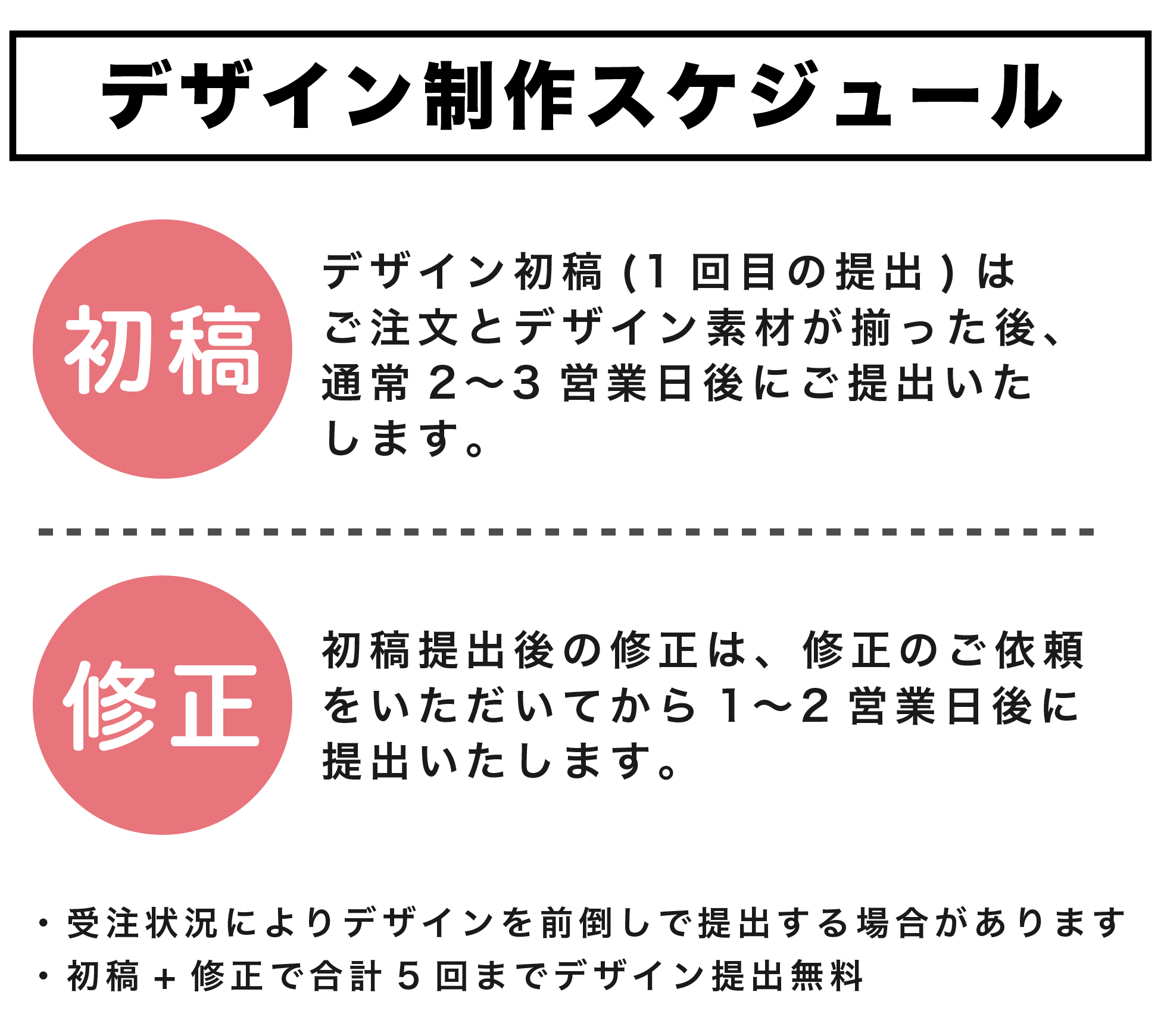 デザイン制作に必要な素材が揃い次第、初稿提出に2〜3営業日、修正提出は1〜2営業日を要します。