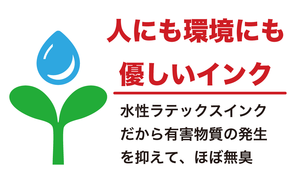 臭いや有害物質の心配がないラテックスインクを使用したエコターポリンの印刷です。ほぼ無臭なので病院やケア施設、保育園でのご利用も安心です。