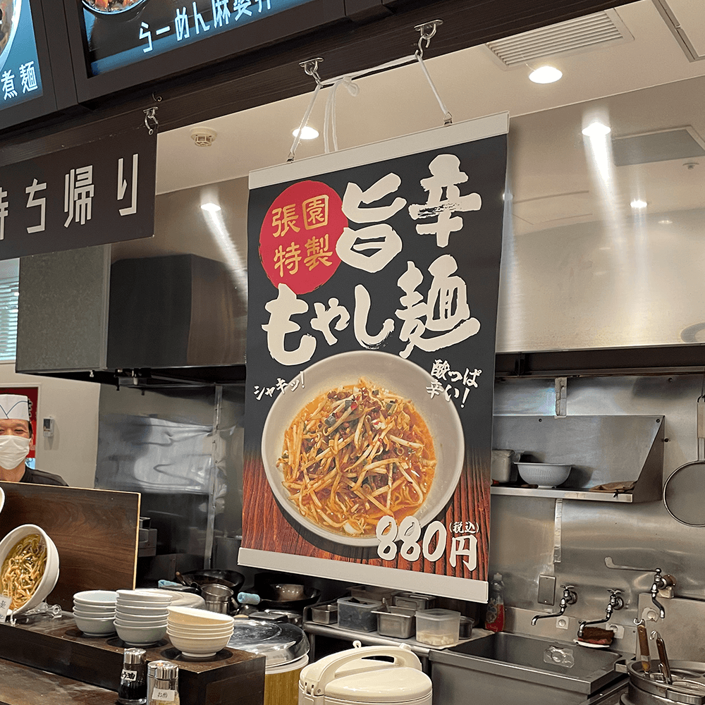 A:タペストリーとは簡単に言うと「壁掛け」です。上下にバーと紐がついており簡単に設置できる広告ツールです。飲食店で使用されていることが多いですが、ジャンルや業種問わず様々な場所で使用されています。