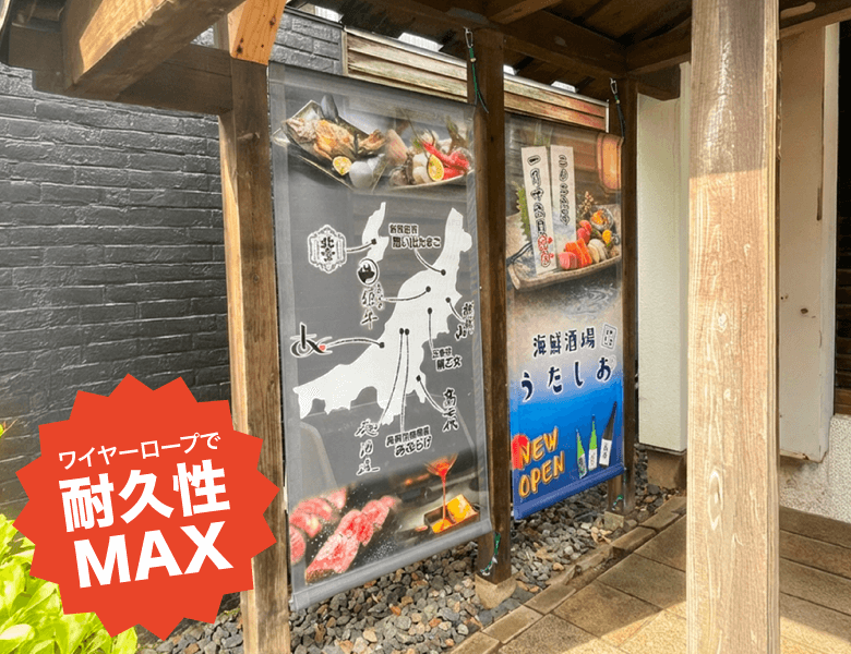 A:ワイヤーロープは細い銅線を撚り合わせてできた金属製の上部なロープです。スレや引張に強い強度を誇りますので、店頭や軒下、イベント会場でのタペストリー常設をお考えのお客様にお勧めです。
