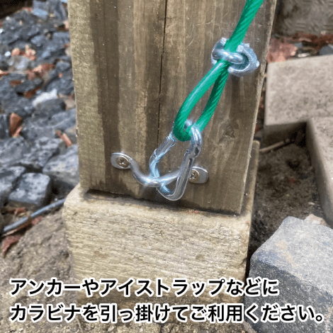 ロープの先にはカラビナを取り付けておりますので、地面や壁面に打ち付けたアンカーや、アイストラップなど引っ掛けられる金具にくくりつけてご利用ください。
