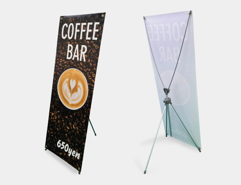 A:店頭での広告やイベント告知など、幅広い用途でご利用頂けます。ターポリン印刷とバナースタンドがセットになりますので届いてからすぐにご利用いただくことが可能です。